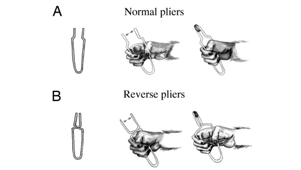 Ayna nöronlar dil ediniminden otizme, empatiden inme rehabilitasyonuna kadar pek çok başlıkta yoğun ilgiye mazhar olacaktı. Başka bir canlının yaptığı hareketi ayna nöronlar vasıtası ile anlayabiliyorduk, evet ama konu canlılarla da sınırlı değildi. İnsanın aletlerle ilişkisi de bir garipti. Örneğin nesneleri sınıflandırma işlevini yürüten Orbitotemporal Korteks üzerine yürütülen bir çalışmada el aletlerinin insan eli ile neredeyse aynı biçimde kategorize edildiği anlaşılacaktı. Bu benzerlik omuz gibi farklı uzuvlar için geçerli değildi. Aletleri adeta elimizin bir uzantısı ya da versiyonu gibi algılıyor olabilirdik. Başka bir çalışmada maymunlar pense kullanımı için eğitildiklerinde, pense ile kavrama ve el ile kavrama hareketleri için aynı nöronların etkinleştiği gösterilmiş. Çalışmanın fantastik tarafı maymunları bir de ters pense için de eğitmiş olmaları. Ters pense el ile sıkıldığında gevşeyen, el ile gevşetildiğinde ise sıkan bir tür (aşağıdaki resme bakınız). Ters pensede de kavrama hareketi için (el ile gevşetme hareketi yapılıyor olsa da) beyinde el ile kavrama hareketi için etkinleşen nöronların etkinleştiği görülmüş. Yani el sıkma hareketi de, gevşetme hareketi de yapıyor olsa, eğitim ile pensenin hareketi ne ise o bölge etkinleşiyor. Eğitim ile pense maymunun adeta bir uzantısı haline geliyordu.